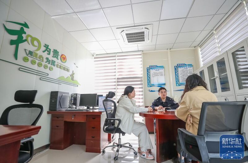 4月27日,在江苏省句容市宝华镇的“两市一窗”宝华警务室政务服务大厅调解室,警务人员为居民开展矛盾调解工作。