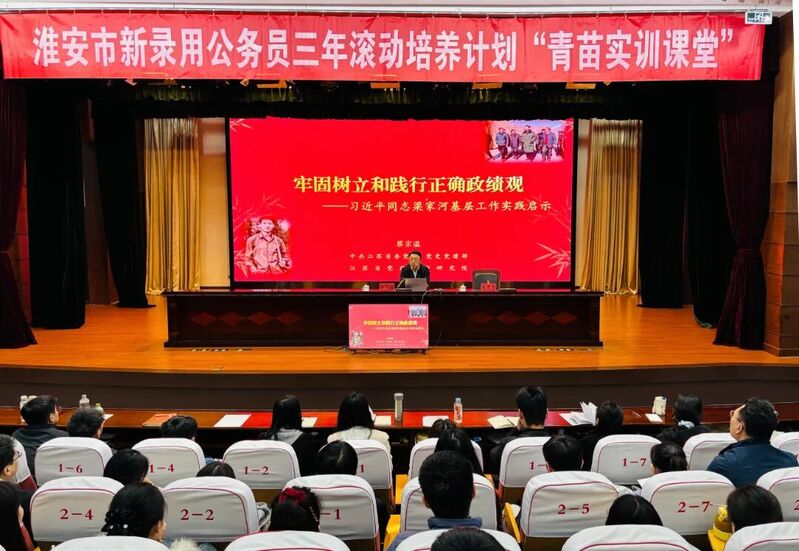 4月9日,淮安市委组织部按照《淮安市公务员队伍建设服务高质量发展五年行动方案》和“新录用公务员三年滚动培养计划”要求,在淮安市委党校举办2026年第1期(总第10期)“青苗实训课堂”,聚焦引导全市新录用公务员扣好“第一粒扣子”,牢固树立和践行正确政绩观,邀请江苏省委党校(行政学院)党史党建教研部副教授蔡宗溢,专题讲授《牢固树立和践行正确政绩观——习近平同志梁家河基层工作实践启示》,本期组织全市2024年以来部分新录用公务员共331人参训。
